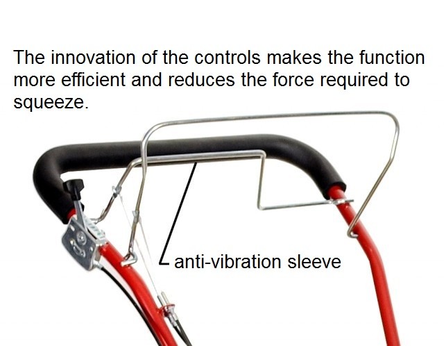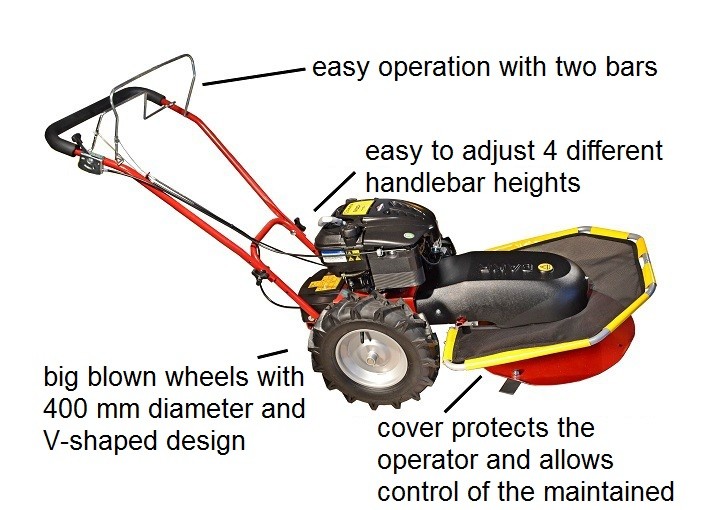 The machine has a split axle that keeps the mower in the cutting direction when the drive is engaged and does not change direction on uneven ground, but allows easy turning.